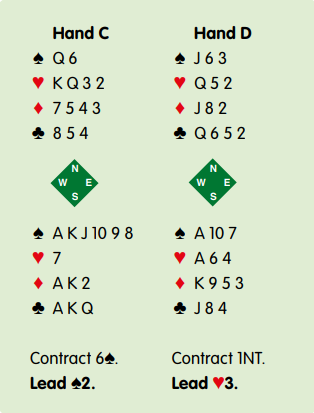 In Hand C, you have 11 top tricks, six spades, the ♦️A-K and ♣️A-K-Q. You need a twelfth and that will come from developing a heart trick. You have two losers in your hand—a heart and a diamond. I find it helpful to pair up losers in the stronger hand with winners in the opposite hand. You cannot avoid a heart loser, but you can develop a heart trick in dummy to discard your ♦️2. The key to this hand is pairing up your losing ♦️2 with one of dummy’s hearts. You must diagnose another potential problem—that you need access to your heart winner. This can only come with the ♠️Q, therefore you cannot start by drawing trumps. You must set about establishing the heart winner, so you win the ♠️A at trick 1 and lead a heart.