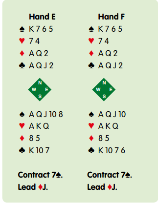 In Hands E and F, you have bid to the giddy heights of a grand slam. You have to make a decision at trick 1: whether or not to take the diamond finesse.
