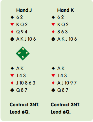 In Hand J, you have seven top tricks, the ♠️A-K and five clubs. You can set up two tricks in hearts (losing the lead once to the ♥️A) or three tricks in diamonds (losing the lead twice to the ♦️A-K). However, the opening lead has knocked out one of your two spade guards and you can only afford to lose the lead once more, so you must play on hearts.