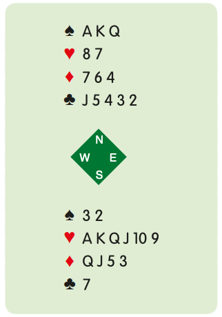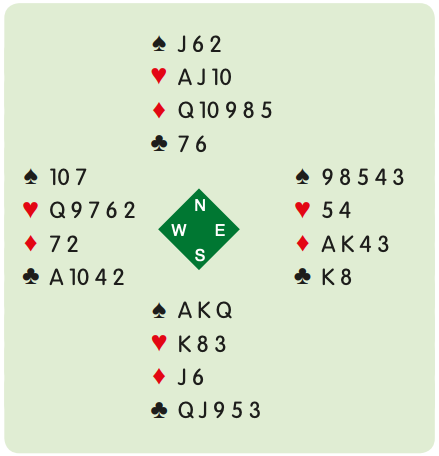If your hearts are ❤️K-8 facing ❤️A-J, you are going down. When you play a low heart, West can play the queen, which you win but that leaves you with the ❤️K in your hand and the ❤️J in dummy. You have no entry to dummy so even though you can set up the diamonds, you have no way to get to them. The solution comes about with proper play at trick one. I reminded you to consider what that ❤️6 indicated. Six from eleven is five. You have three hearts in dummy and two in your hand that are higher than the six. East can’t have one higher since they are all accounted for. The correct play is to win the first heart with your ❤️K. Here is the layout: