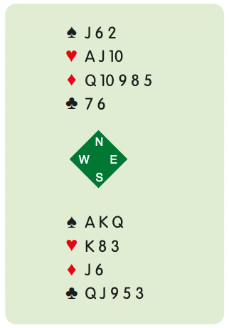 South opens 1NT(15-17) in first seat and North raises to 3NT. North has only eight high card points but he has a good five-card suit and he has the ❤️10, too. These little extras add up. Imagine, for instance, that North had the ♦️Q-9-8-7-3 instead of the ♦️Q-10-9-8-5. It would be much harder for South to set up the diamond suit. That ♦️10 is a huge plus for play in 3NT.