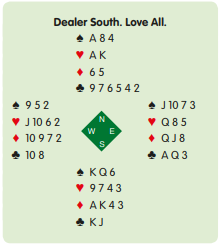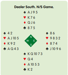 When the 3♣️ appeared from Lady DeClerc, it seemed he would need West to hold ♣️Q–10. The Sheriff played the K♣️ from his hand, and West followed with the 8♣️. On the next trick, the J♣️ pinned West’s 10♣️ and Lady DeClerc won with the Q♣️. She dislodged dummy’s K♥️ with her Q♥️ and won the next round of clubs with the ace. A heart return gave her husband two tricks in that suit, but the game was home. The Sheriff had lost just two clubs and two hearts.