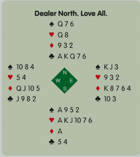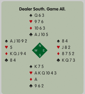 Hood soon spotted the play that was required. He won with the trump ace and then led the queen of clubs from his hand. William Cabot won with the king and returned a trump to declarer’s king. Hood crossed to dummy with the jack of clubs and discarded a heart on the ace of diamonds. A total of two clubs and a heart had to be lost, but the game was his.
